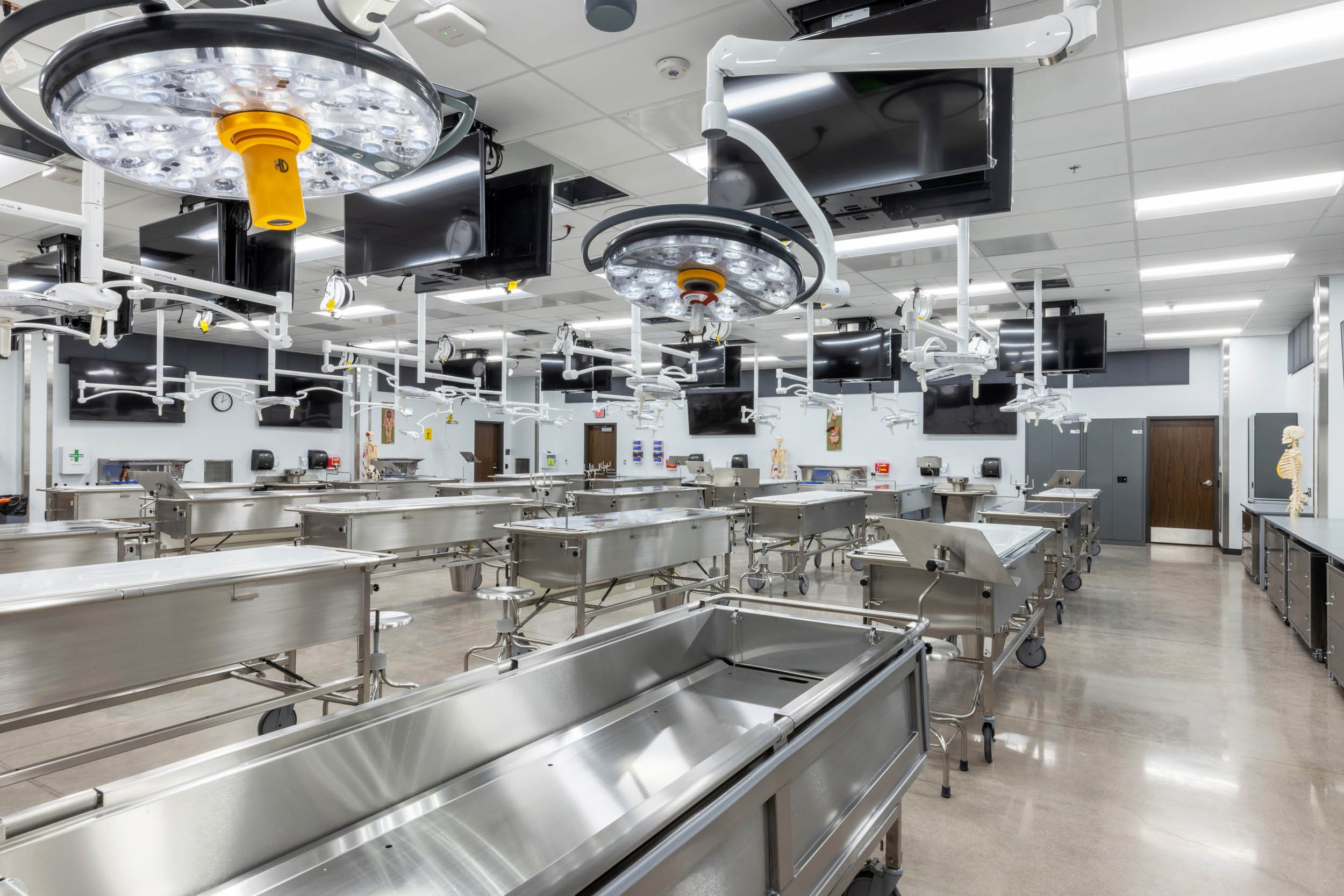 The Health Sciences Center addition and renovation included new educational classrooms, an ADA testing space, faculty, offices, anatomy lab, multi-use labs, and support spaces. The Gross Anatomy Suite included 20 workstations with overhead surgical light booms, necropsy sinks, and a cadaver cooler. Complex coordination of the overhead MEP and support structures were required to make sure that everything was laid out as specified for each workstation.